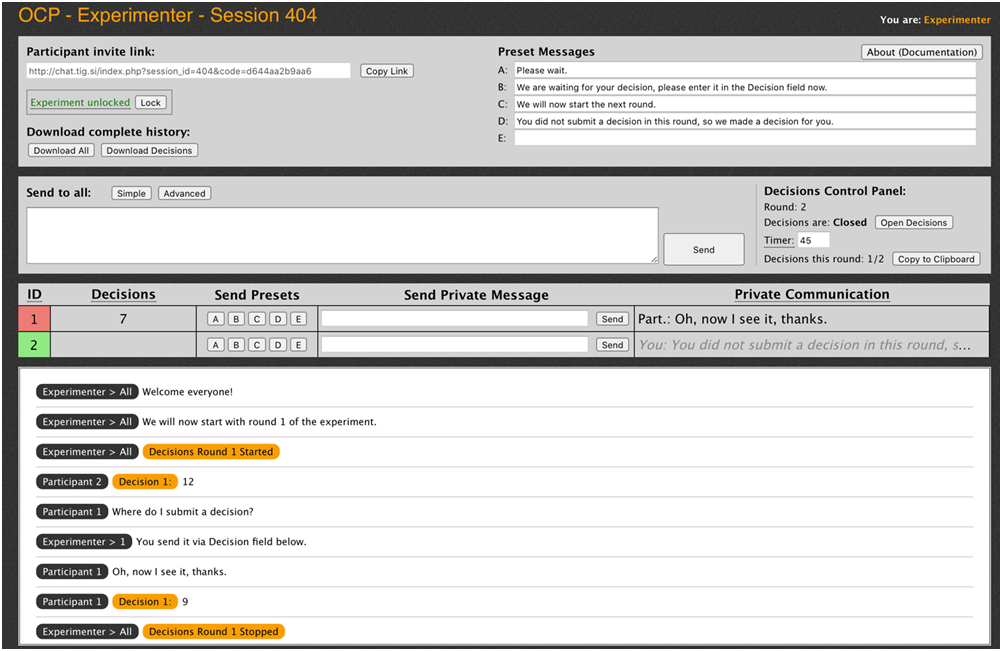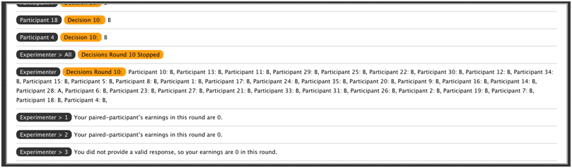 Finally, at the bottom of the experimenter interface you have a chronological list of all messages and decisions that were sent in this session. You can scroll up to revisit earlier message communication or decisions. Messages indicate who sent them and to whom. Decisions are indicated with orange color and the participant ID. When you close the decisions, a list of all decisions is shown there, in case you need to go back and review some past decisions.