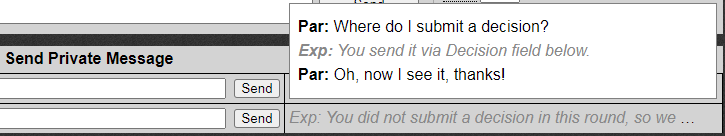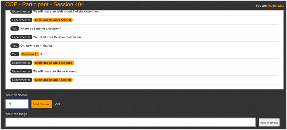 On top the interface shows the session number - this should be the same number that the experimenter sees on their screen. Below they see a list of all their decisions and communication with the experimenter, including all experimenter public announcements and decision rounds. Below this list there are two entry boxes: the decision box "Your decision" and the message box "Your message".