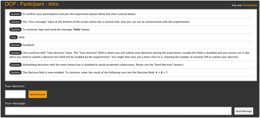 The participant starts with an introduction where she needs to type a message and send a Decision, to familiarize herself with the interface. This also prevents participants erroneously opening several instances of the interface on their computer. They can still do so, but need to open them in different browsers and go through the introduction every time.